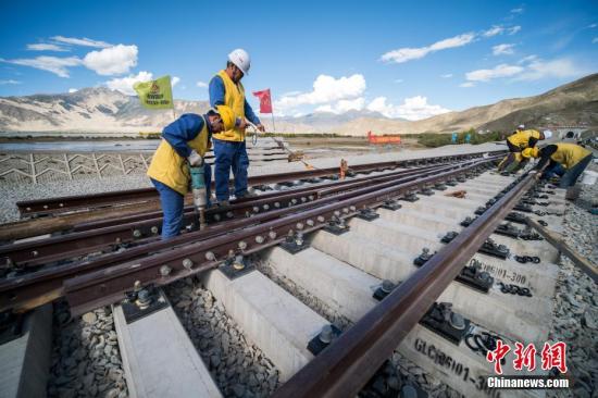 9月16日,川藏铁路拉萨至林芝段首组道岔进行铺设,首组铺设道岔所在地属西藏山南市贡嘎车站,是拉林铁路第一个新建车站,设计新铺设道岔15组,每组道岔长43.2米。图为中铁十一局三公司施工人员在川藏铁路拉林段铺设首组道岔。 中新社记者 何蓬磊 摄