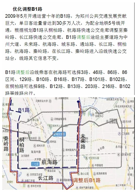 B1路从桐柏路、航海路调至秦岭路、长江路:为配合地铁5号线开通,根据规划,B1路从桐柏路、航海路快速公交走廊调整至秦岭路、长江路快速公交走廊。