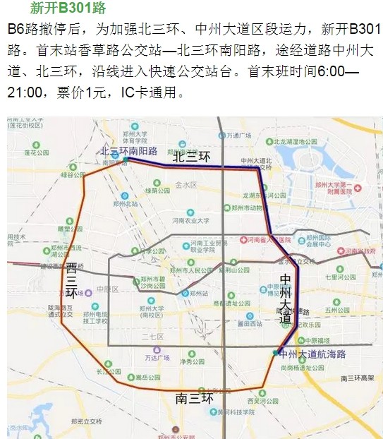 新开B301路:B6路撤停后,为加强北三环、中州大道区段运力,新开B301路。首末站香草路公交站—北三环南阳路,途经中州大道、北三环,沿线进入快速公交站台。