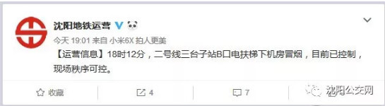 沈阳地铁官方微博19:01发文称,18时12分,二号线三台子站B口电扶梯下机房冒烟,目前已控制,现场秩序可控。