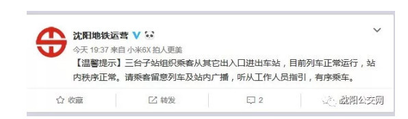 沈阳地铁官方微博19:37第二次发文称,三台子站组织乘客从其它出入口进出车站,目前列车正常运行,站内秩序正常。请乘客留意列车及站内广播,听从工作人员指引,有序乘车。