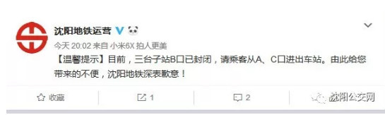 沈阳地铁官方微博20:02第三次发文称,目前,三台子站B口已封闭,请乘客从A、C口进出车站。由此给您带来的不便,沈阳地铁深表歉意!