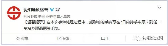 沈阳地铁官方微博20:48第四次发文称,在本次事件处理过程中,受影响的乘客可在7日内持手中票卡到任一车站办理退票等手续。