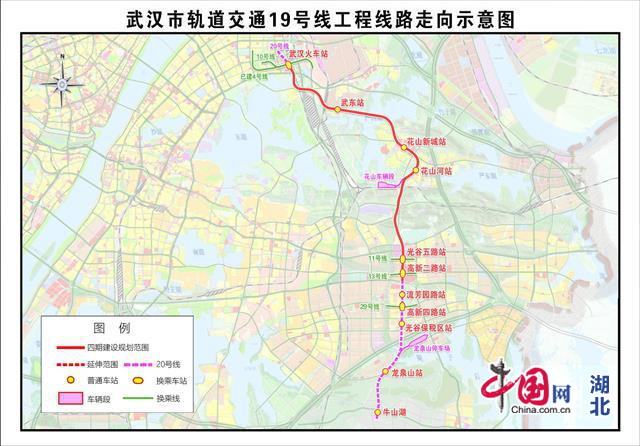 公开信息显示,19号线设有武汉火车站、光谷五路站和高新二路站等3座换乘站。其中在武汉火车站与已开通的4号线、在建的5号线和规划的20号线、新港线交汇换乘;在光谷五路站与已通车的11号线东段一期换乘;在高新二路站与规划13号线实现换乘。