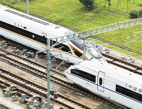 一列“复兴号”动车组在京沪高铁线路上与“和谐号”动车组交会。 苏 阳摄(新华社发)