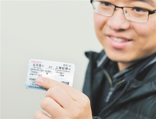 2019年1月5日,乘客展示自己的超长版“复兴号”车票。当日,超长版时速350公里“复兴号”正式亮相京沪高铁。