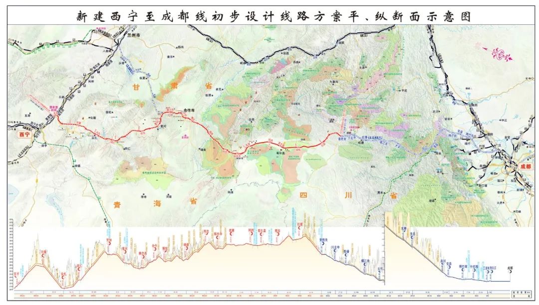 新建西宁至成都铁路是国家“八纵八横”高速铁路主通道兰广通道的重要组成部分,“十三五”交通扶贫“双百工程”中16个铁路项目之一。线路自西宁枢纽海东西站引出,经青海省海东市、黄南藏族自治州,甘肃省甘南藏族自治州,四川省阿坝藏族羌族自治州,与在建成兰铁路黄胜关站接轨后,共线引入成都枢纽。