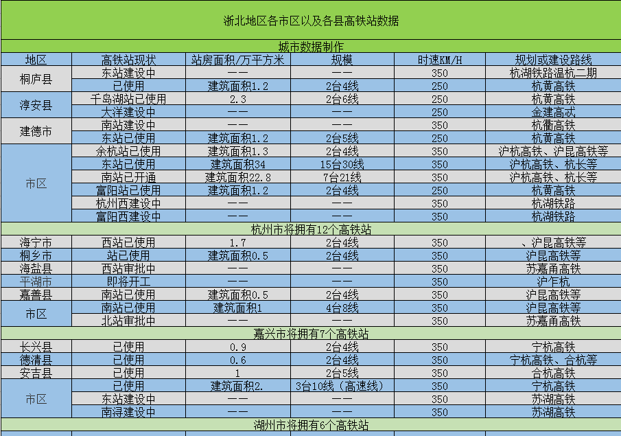 二市共有11个县级代为和3个城区,截至目前为止共有15个高铁站开通并且已经使用,其中嘉兴和湖州各四个而杭州则有7个,这15个高铁站基本都是位于合杭高铁、宁杭高铁、沪昆高铁还有杭黄高铁线上,另外还有7个高铁站在建设中,基本都是位于杭衢高铁、杭湖高铁、苏湖高铁线上,除此之外苏嘉甬高铁线上还有2个高铁站在审批之中