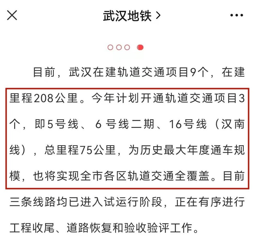 据武汉地铁消息:目前,武汉在建轨道交通项目9个,在建里程208公里。今年计划开通轨道交通项目3个,即5号线、6号线二期、16号线(汉南线),总里程75公里,为历史最大年度通车规模,也将实现全市各区轨道交通全覆盖。目前三条线路均已进入试运行阶段,正在有序进行工程收尾、道路恢复和验收验评工作。