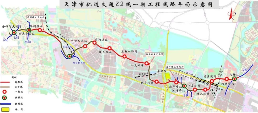 Z2线一期工程起自金钟河大街站,终至北塘站,其中金钟河大街站为M5、M6和Z2线换乘站,北塘站为Z2、Z4线换乘站。本线连接滨海机场、滨海西高铁站两大交通枢纽。沿线主要经过河北区、东丽区、空港经济区、滨海高新区、开发区西区、海洋高新区、开发区等多个行政区。项目是支撑城市新的空间战略的实施,满足双城之间相向发展,实现外围新城与“双城”的快速、便捷联系的需要;是满足沿线出行需求,缓解机动车对城市道路造成的交通压力的需要。