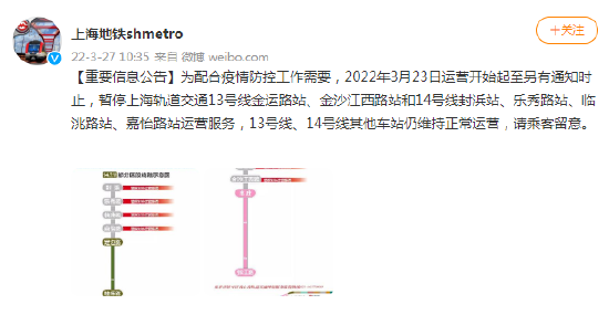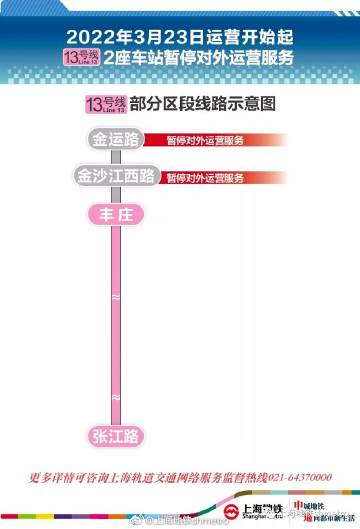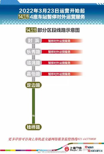 为配合疫情防控工作需要,2022年3月23日运营开始起至另有通知时止,暂停上海轨道交通13号线金运路站、金沙江西路站和14号线封浜站、乐秀路站、临洮路站、嘉怡路站运营服务,13号线、14号线其他车站仍维持正常运营,请乘客留意。