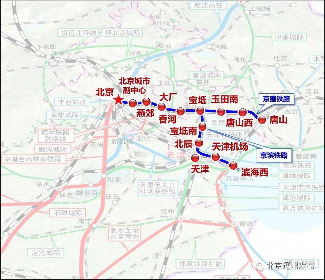 京唐城际铁路起自北京城市副中心站,终至河北省唐山市既有唐山站,途经北京市通州区、河北省廊坊市、天津市宝坻区、河北省唐山市,线路全长约148.7公里,设计最高时速350公里。全线共设置车站8座,分别为北京城市副中心站、燕郊站、大厂站、香河站、宝坻站、玉田南站、唐山西站、唐山站。项目建成初期,列车由北京站始发,至唐山站城际车场。京唐城际铁路是京津冀地区城际轨道交通网的骨干线路,经通燕联络线与京哈线衔接,经唐滦联络线与津秦高铁衔接,是以城际客流为主、同时承担部分中长途跨线客流运输功能的高速铁路。