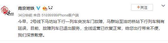 今早,南京地铁2号线下马坊站下行一列车突发车门故障,马群站至油坊桥站下行列车稍有延误,目前,故障列车已退出服务,全线运营已恢复正常,给您出行带来不便,我们深表歉意。