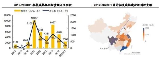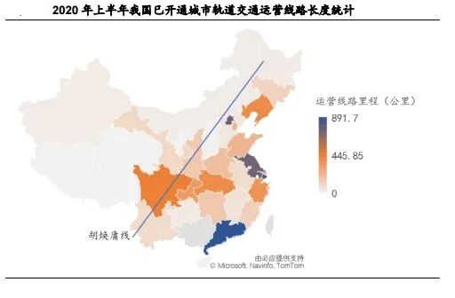 2012 年至 2020 年上半年,国家发改委共计批复城市轨道交通建设规划(含调整)45 个,累计投资额 3.9 万亿元,累计里程数 6016 公里。2015 年,批复投资额与里程数均达近些年最高峰。从国家发改委批复的城市分布来看,主要集中在“胡焕庸线”以东,与国内人口分布相适应,中西部城市建设潜力长期有待发掘。