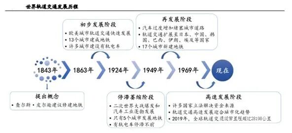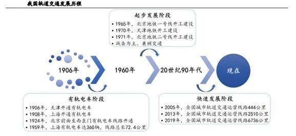 国内城轨发展历史分三个阶段,已进入全面快速发展。1899 年,德国西门子在北京修建有轨电车,连接马家堡火车站与永定门;1904 年、1906 年、1908 年,香港、天津、上海先后开通有轨电车,日本和俄国相继在大连、哈尔滨、长春、沈阳开通有轨电车;1924 年 12 月 19 日,北京前门至西直门的有轨电车线路开通;1959 年,上海的有轨电车达 360 辆,线路总长 72.4 公里。