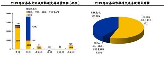 欧亚大陆是主要市场,地铁成主要制式。2019 年,全球共计 75 个国家和地区的 520 座城市开通城市轨道交通,运营里程达 2.82 万公里。其中亚洲运营里程 1.07 万公里,占比 38%;欧洲运营里程 1.47 万公里,占比 52%。欧亚大陆是全球城市轨道交通的主要市场。早期有轨电车在欧洲遗留了大量的铁路,经改造、修建后可以直接被现代有轨电车使用。有轨电车建设成本相对地铁较低,运量相对公交较高,在人口密度低的欧洲城市已成为公共交通主干,近二十年在欧洲掀起复兴之风。