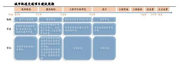 项目建设周期包括八个阶段:线网规划、建设规划、工程可行性研究报告、设计阶段、工程实施、工程验收、试运营、正式运营,各阶段工作过程循序渐进,逐渐形成项目。