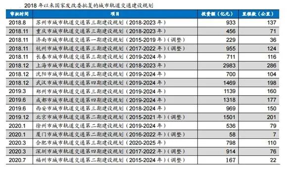 自 2018 年以来,国家发改委共批复 17 个城市的建设规划,累计投资额 15836 亿元,累计里程数 2055 公里。城市轨道交通建设是基础设施建设的重要内容,产业关联范围广、关联度高,能有效推动国内经济的发展,对于 2020 年以来新冠疫情造成的经济冲击可以起到很好的对冲作用,未来城市轨道交通项目审批节奏预计将加快。