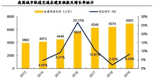 新增及在建里程继续保持增势。2019 年,我国开通城市轨道交通运营线路 208 条,运营线路总长 6736 公里;新增运营线路 25 条,新增运营里程 974.8 公里;共计 56 个城市在建线路 279 条(段),在建里程 6903 公里,有 24 个城市在建线路超过 100 公里。