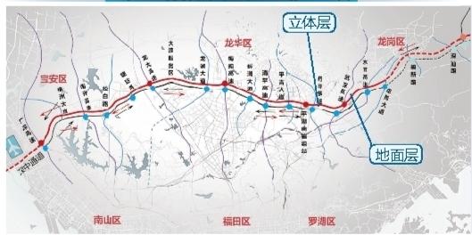 机荷高速衔接城市干道和高速路网示意图 机荷高速改造后,地面层将由原道路6车道改扩建为8车道,共设14处立交(蓝色圆点)以衔接城市干道;立体层以桥梁或隧道的形式新建8车道,设5处立交(红色圆点)以衔接高速路网。