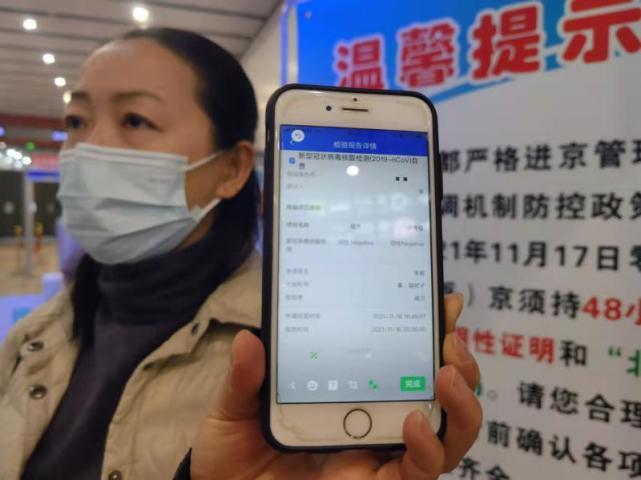 旅客马女士说,她早就从各大网站知道了这个最新措施,她表示在疫情期间这种举措可以理解,她是京津通勤族,昨天在天津做的核酸,今天一早,拿着电子证明在天津站乘车,工作人员在进站口对她的北京健康宝和核酸检测证明进行了检查。