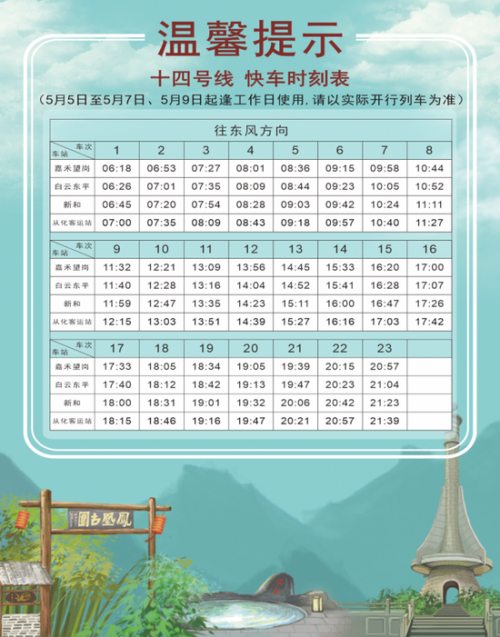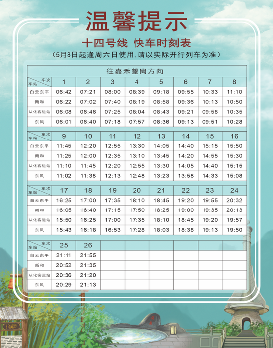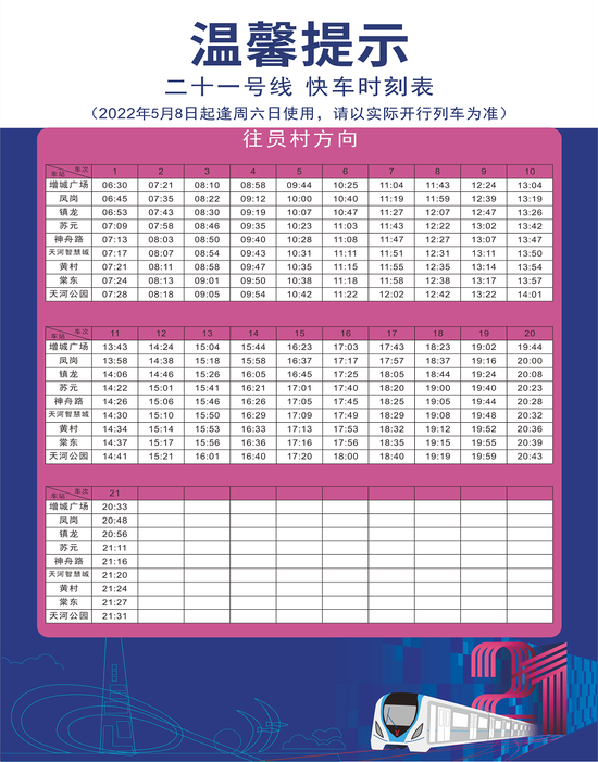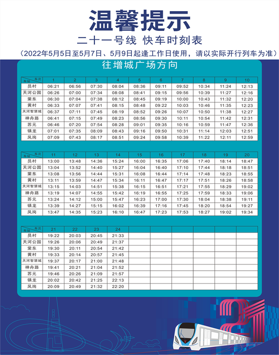 为满足广大市民的乘车需求,方便市民出行,5月5日起,广州地铁十四号线、二十一号线快车时刻表继续调整。