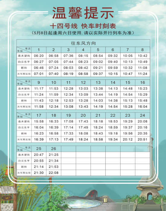 快车的实际到站时间会根据线路运营组织情况有所调整,此时刻表仅做参考,搭乘时请以车站现场广播和电视上的列车信息为准。建议小伙伴们出行时预留宽松的进站时间和候车时间,避免“踩点”出行哟。