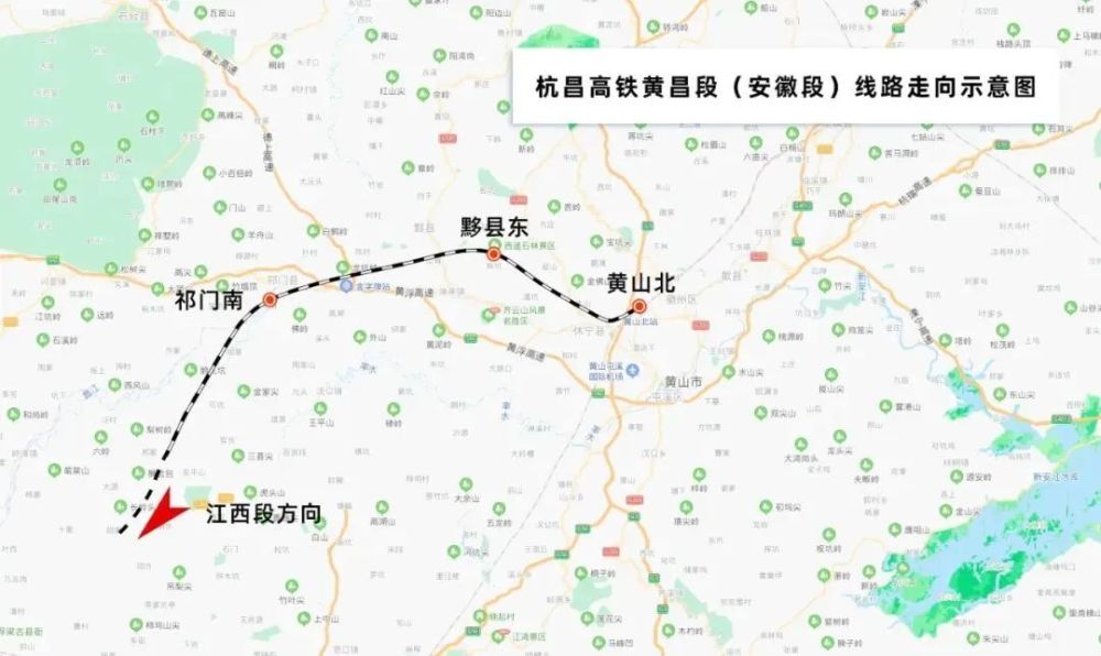 杭昌高铁黄昌段是“八纵八横”主通道基础上的高速铁路区域连接线,是沟通赣皖两省的重要通道,线路全长约290公里,沿线设南昌东、军山湖、余干、鄱阳南、乐平北、景德镇北、瑶里、祁门南、黟县东、黄山北10座车站,设计时速350公里。其中安徽境内约90公里,设祁门南、黟县东、黄山北3座车站。
