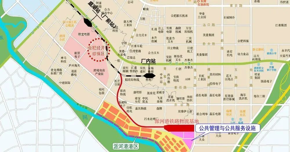 合肥派河港铁路物流基地位于派河北侧、紧邻派河港,为综合性公铁水联运货场,自金源热电厂专用线厂内站西端接轨,新建线路长约3.5公里,新设派河站。该工程包括铁路货场及铁路线建设,规划面积约917亩,其中铁路货场占地约672亩。终点站派河站设有正线1股、到发线2股、货物装卸线4股,预留到发线2股、集装箱装卸线2股。货源直接吸引范围为合肥经济技术开发区,辐射合肥市乃至周边区县范围。
